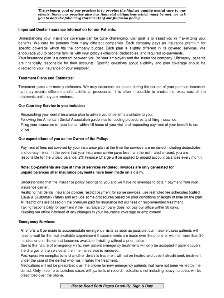 The primary goal of our practice is to provide the highest quality dental care to our clients. Since our practice also has financial obligations which must be met, we ask you to note the following