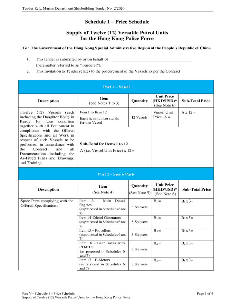 Tender Ref.: Marine Department Shipbuilding Tender No. 2/2020Schedule 1 Price Schedule Supply of Twelve (12) Versatile Patrol Units for the Hong Kong Police Force To: The Government of the Hong Kong