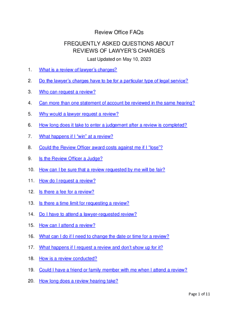 Review Office FAQs FREQUENTLY ASKED QUESTIONS ABOUT REVIEWS OF LAWYERS CHARGES Last Updated on May 10, 2023 1.What is a review of lawyers charges?2.Do the lawyers charges have to be for a particular