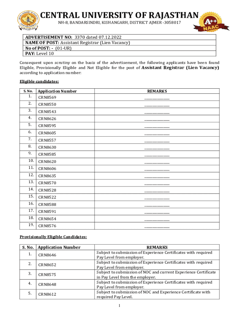 NAME OF POST: Assistant Registrar (Lien Vacancy)