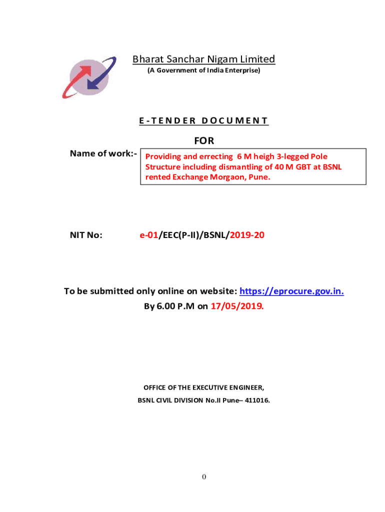 Bharat Sanchar Nigam Limited (A Government of India Enterprise)ETENDER DOCUMENTFORName of work: Providing and errecting 6 M heigh 3legged PoleStructure including dismantling of 40 M GBT at BSNL rented