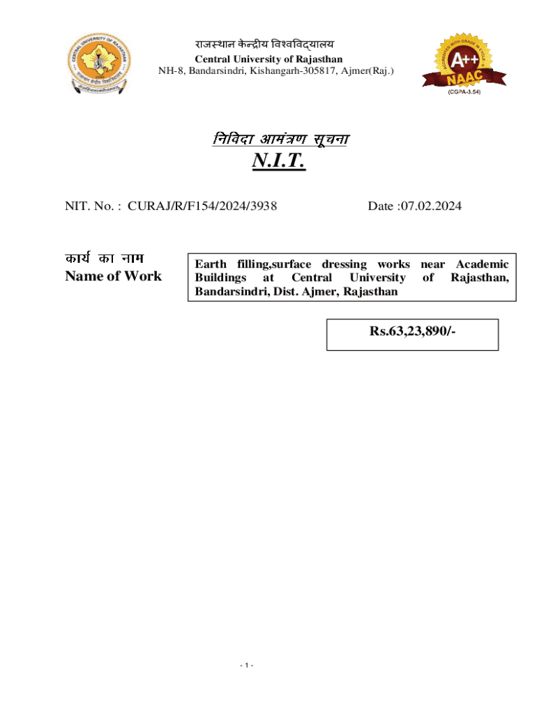 NIT. No. : CURAJ/R/F154/2024/3938Name of WorkDate :07.02.2024Earth filling,surface dressing works near Academic