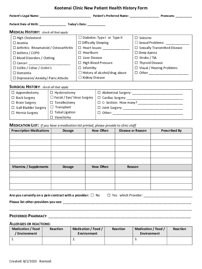 Kootenai Clinic New Patient refers to the process or forms that a new patient must complete when they first visit Kootenai Clinic for medical services.