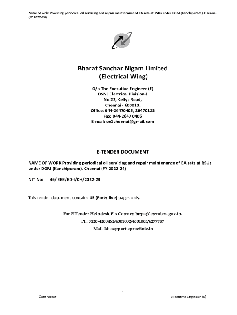 Name of wok: Providing periodical oil servicing and repair maintenance of EA sets at RSS under DAM (Kanchipuram), Chennai