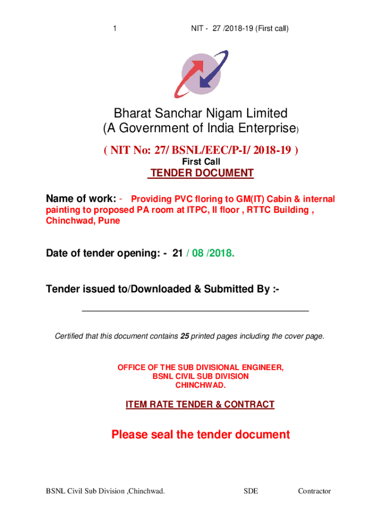 1NIT 27 /201819 (First call)Bharat Sanchar Nigam Limited (A Government of India Enterprise) ( NIT No: 27/ BSNL/EEC/PI/ 201819 ) First CallTENDER DOCUMENT Name of work: Providing PVC floring to GM(IT)