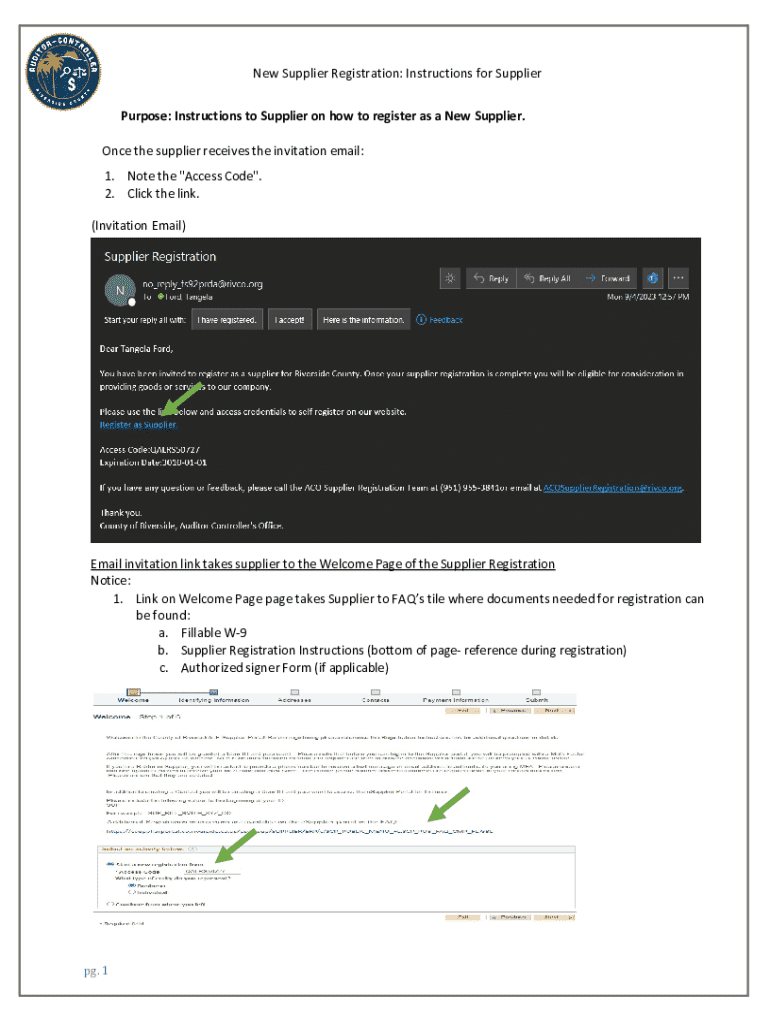 New Supplier Registration: Instructions for Supplier Purpose: Instructions to Supplier on how to register as a New Supplier. Once the supplier receives the invitation email: 1. Note the \"Access Code\".