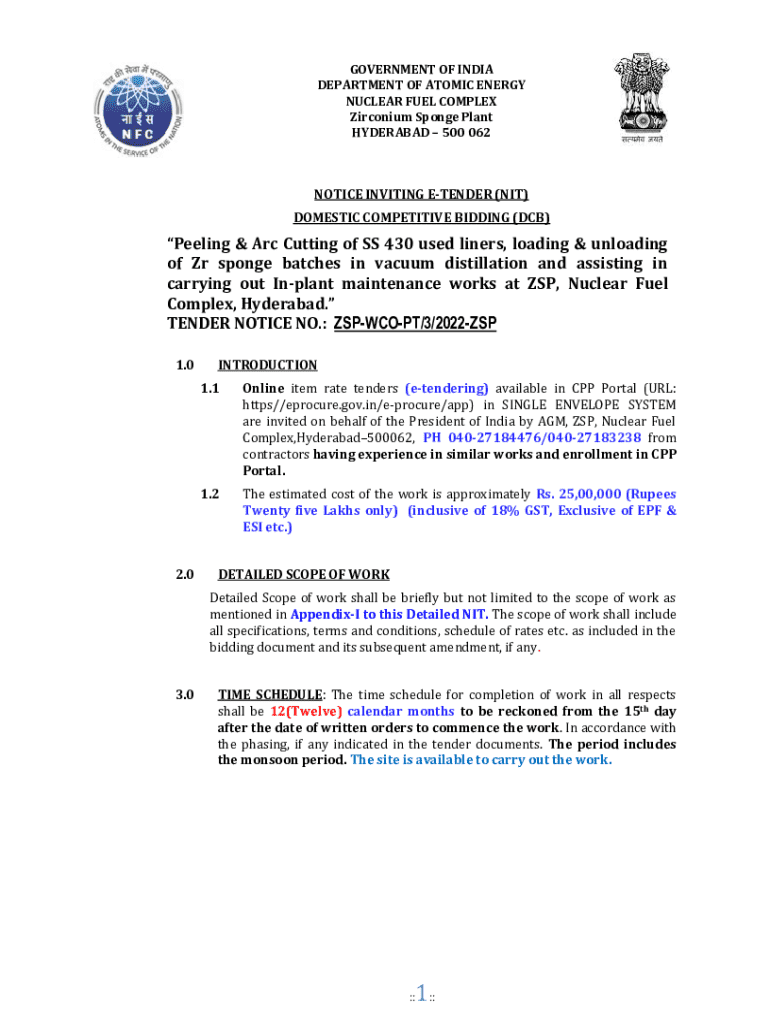 GOVERNMENT OF INDIA DEPARTMENT OF ATOMIC ENERGY NUCLEAR FUEL COMPLEX Zirconium Sponge Plant HYDERABAD 500 062NOTICE INVITING ETENDER (NIT) DOMESTIC COMPETITIVE BIDDING (DCB)Peeling & Arc Cutting of
