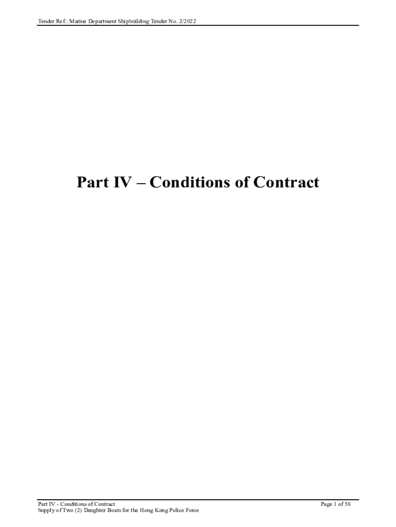 Tender Ref.: Marine Department Shipbuilding Tender No. 2/2022Part IV Conditions of ContractPart IV Conditions of Contract Supply of Two (2) Daughter Boats for the Hong Kong Police ForcePage 1 of 58Tender