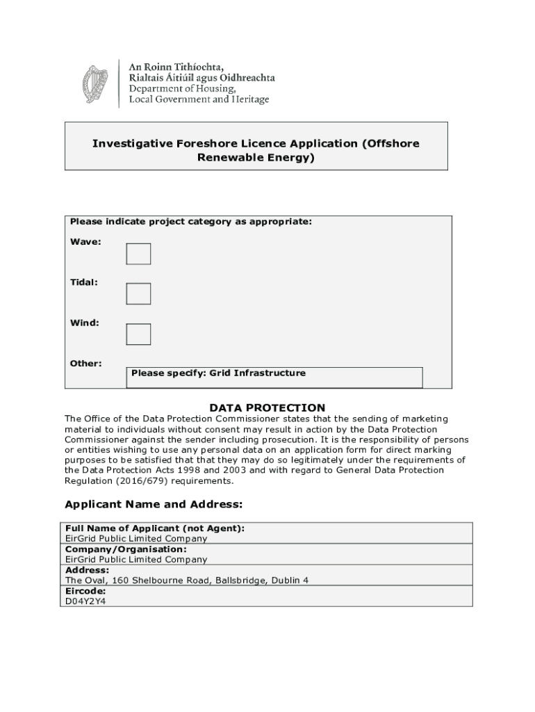 Investigative Foreshore Licence Application (Offshore Renewable Energy)Please indicate project category as appropriate: Wave:Tidal:Wind:Other:Please specify: Grid InfrastructureDATA PROTECTION The