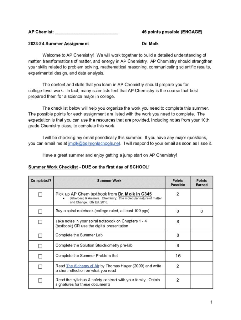 AP Chemist: ___46 points possible (ENGAGE)202324 Summer Assignment Dr. MolkWelcome to AP Chemistry! We will work together to build a detailed understanding of