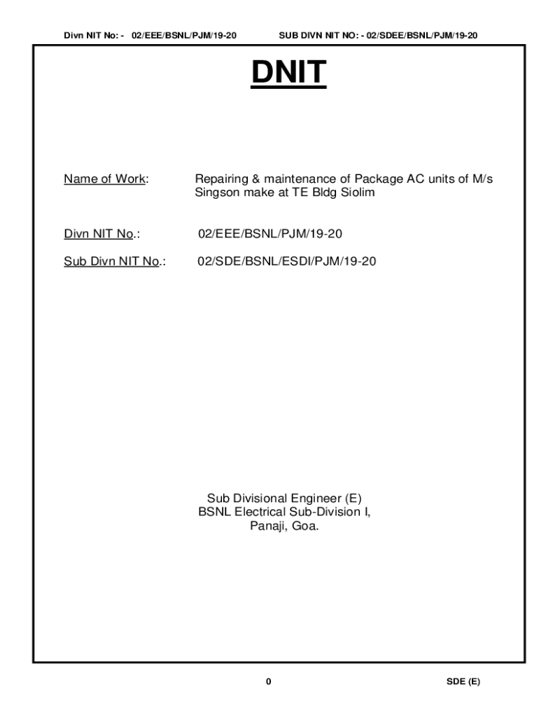 Dive NIT No: 02/EEE/BSNL/PM/1920SUB DIVE NIT NO: 02/SEE/BSNL/PM/1920DNITName of Work:Repairing & maintenance of Package AC units of M/s