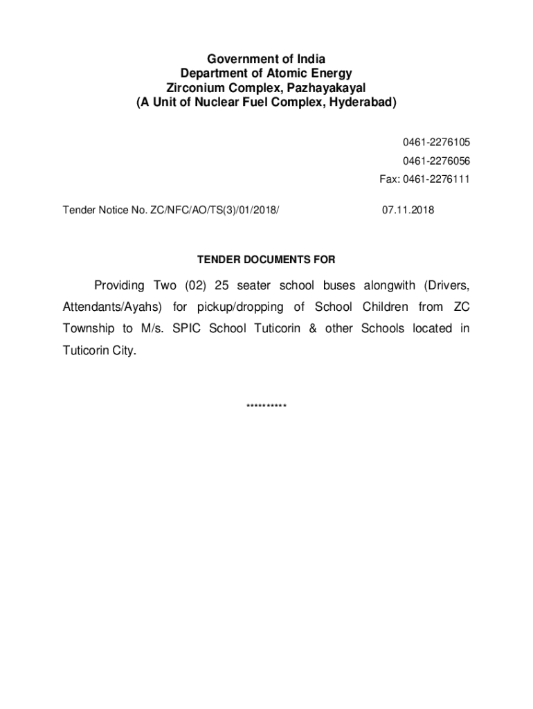 Government of India Department of Atomic Energy Zirconium Complex, Pazhayakayal (A Unit of Nuclear Fuel Complex, Hyderabad) 04612276105 04612276056 Fax: 04612276111 Tender Notice No. ZC/NFC/AO/TS(3)/01/2018/07.11.2018TENDER