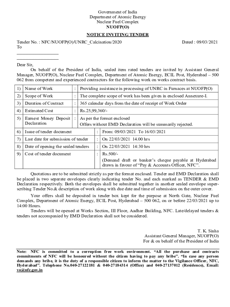 NOTICE INVITING TENDER No. NFC/UFP(O)/UNC_Calculation/2020