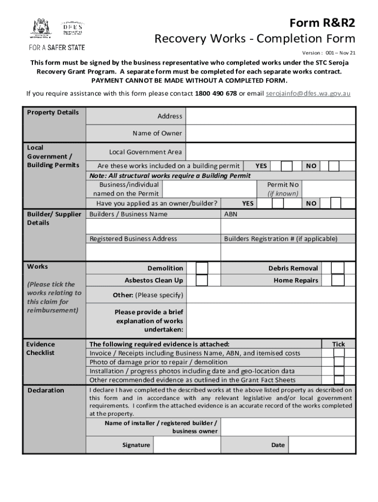 Recovery Works Completion Form