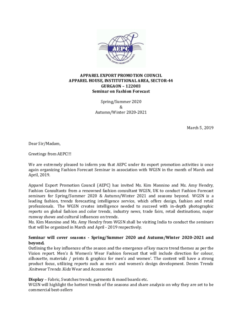 APPAREL EXPORT PROMOTION COUNCIL APPAREL HOUSE, INSTITUTIONAL AREA, SECTOR44 GURGAON 122003 Seminar on Fashion Forecast Spring/Summer 2020 & Autumn/Winter 20202021 March 5, 2019 Dear Sir/Madam, Greetings