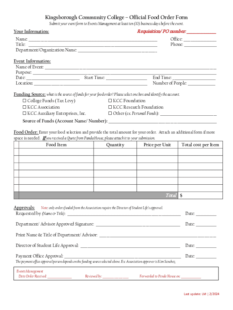 Kings borough Community College Official Food Order Form