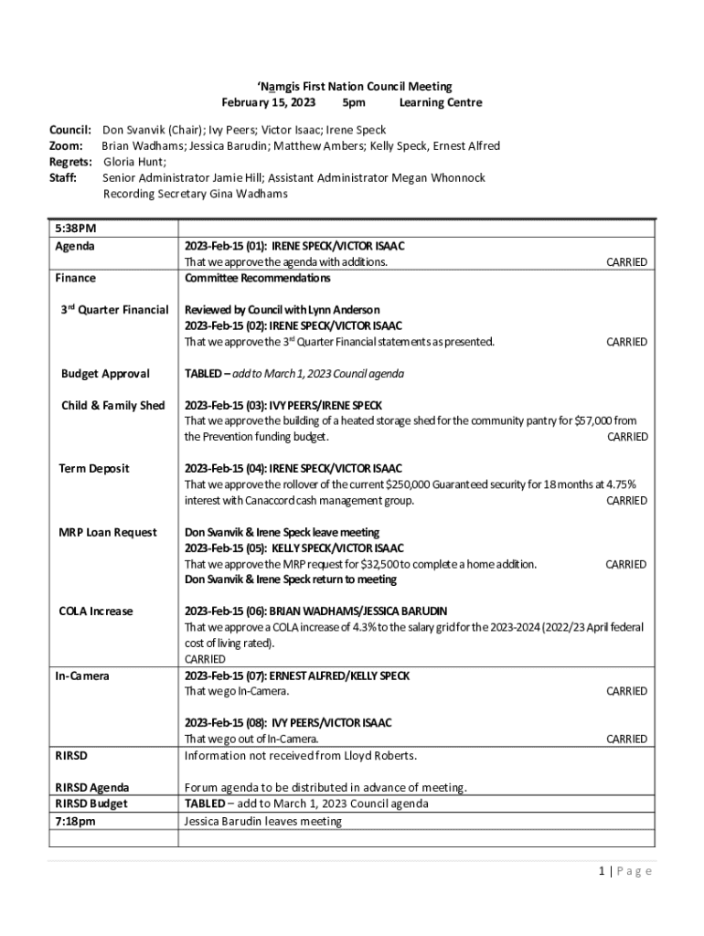Staff:Don Sank (Chair); Ivy Peers; Victor Isaac; Irene Speck