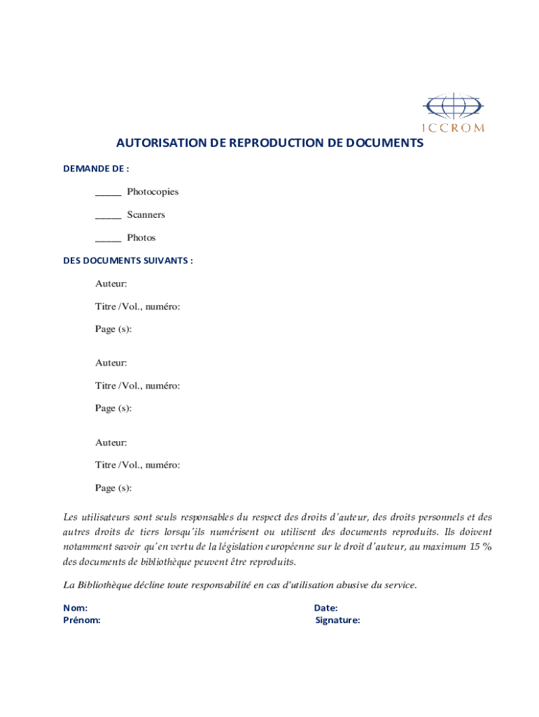 AUTORISATION DE REPRODUCTION DE DOCUMENTS DEMANDE DE : ___ Photocopies ___ Scanners ___ Photos DES DOCUMENTS SUIVANTS : Auteur: Titre /Vol., numro: Page (s):Auteur: Titre /Vol., numro: Page (s):Auteur: