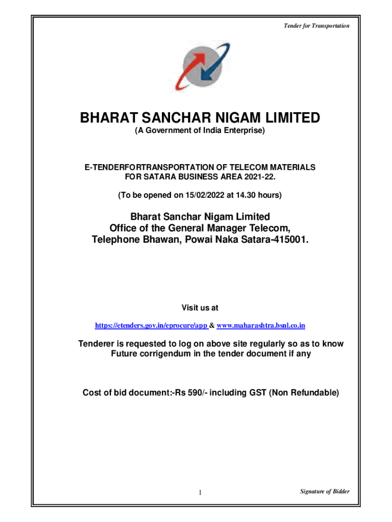 Tender for TransportationBHARAT SANCHAR NIGAM LIMITED (A Government of India Enterprise)ETENDERFORTRANSPORTATION OF TELECOM MATERIALS FOR SATARA BUSINESS AREA 202122. (To be opened on 15/02/2022 at