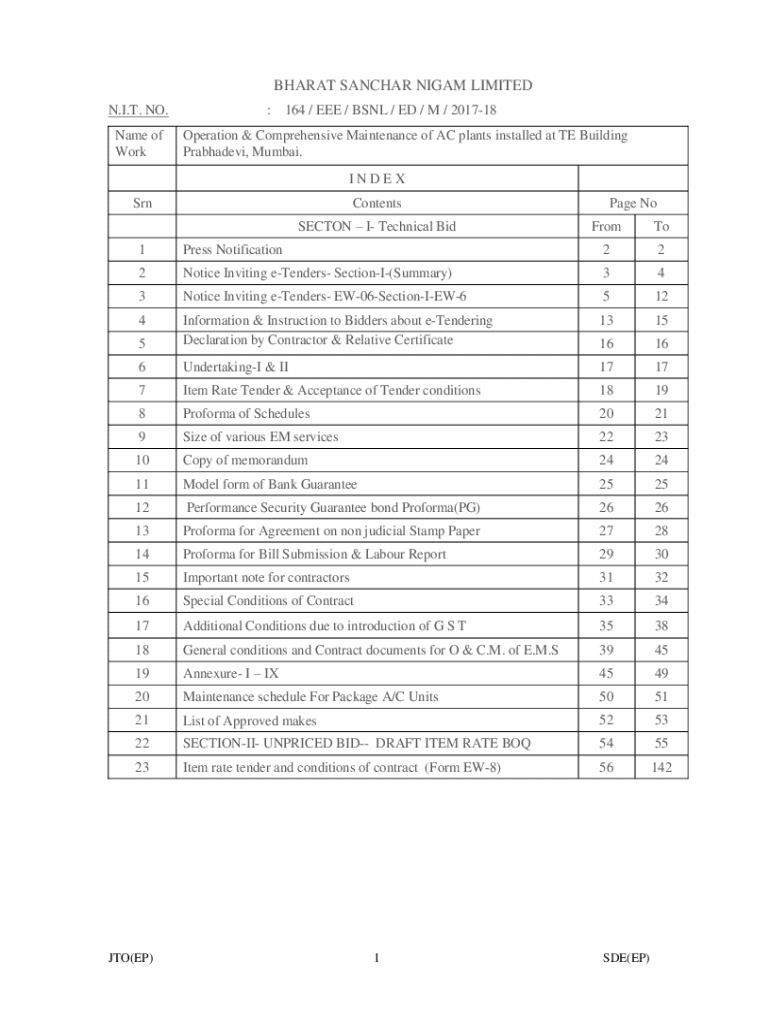 BHARAT SANCHAR NIGAM LIMITED N.I.T. NO. Name of Work:164 / EEE / BSNL / ED / M / 201718Operation & Comprehensive Maintenance of AC plants installed at TE Building Prabhadevi, Mumbai. INDEXSrnContents