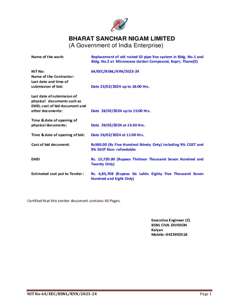 BHARAT SANCHAR NIGAM LIMITED (A Government of India Enterprise) Name of the work:Replacement of old rusted GI pipe line system in Bldg. No.1 and Bldg. No.2 at Microwave station Compound, Kopri, Thane(E)NIT