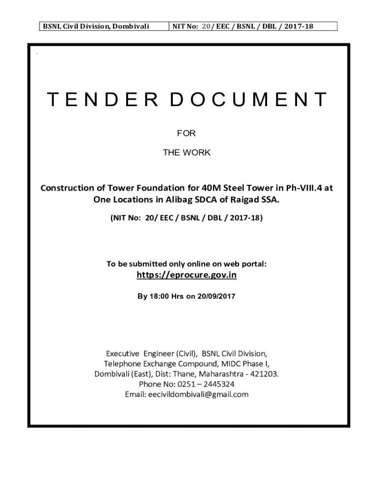 BSNL Civil Division, DombivaliNIT No: 20/ EEC / BSNL / DBL / 201718.TENDER DOCUMENT FOR THE WORKConstruction of Tower Foundation for 40M Steel Tower in PhVIII.4 at One Locations in Alibag SDCA of