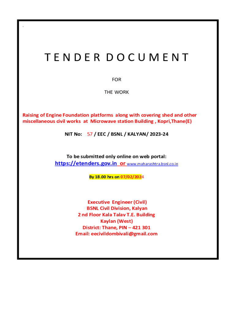 .TENDER DOCUMENT FOR THE WORKRaising of Engine Foundation platforms along with covering shed and other miscellaneous civil works at Microwave station Building , Kopri,Thane(E) NIT No: 57 / EEC / BSNL