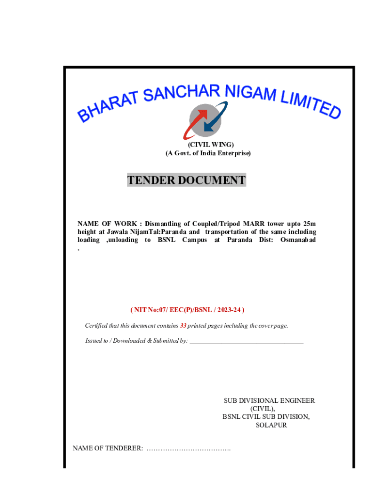 (A Govt. of India Enterprise)TENDER DOCUMENTNAME OF WORK : Dismantling of Coupled/Tripod MARR tower upto 25m