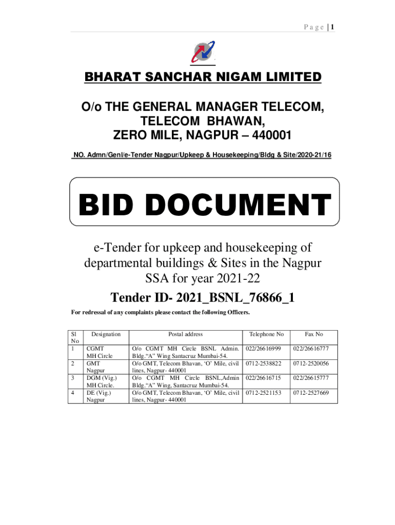 Page |1BHARAT SANCHAR NIGAM LIMITED O/o THE GENERAL MANAGER TELECOM, TELECOM BHAWAN, ZERO MILE, NAGPUR 440001 NO. Admn/Genl/eTender Nagpur/Upkeep & Housekeeping/Bldg & Site/202021/16BID DOCUMENT eTender