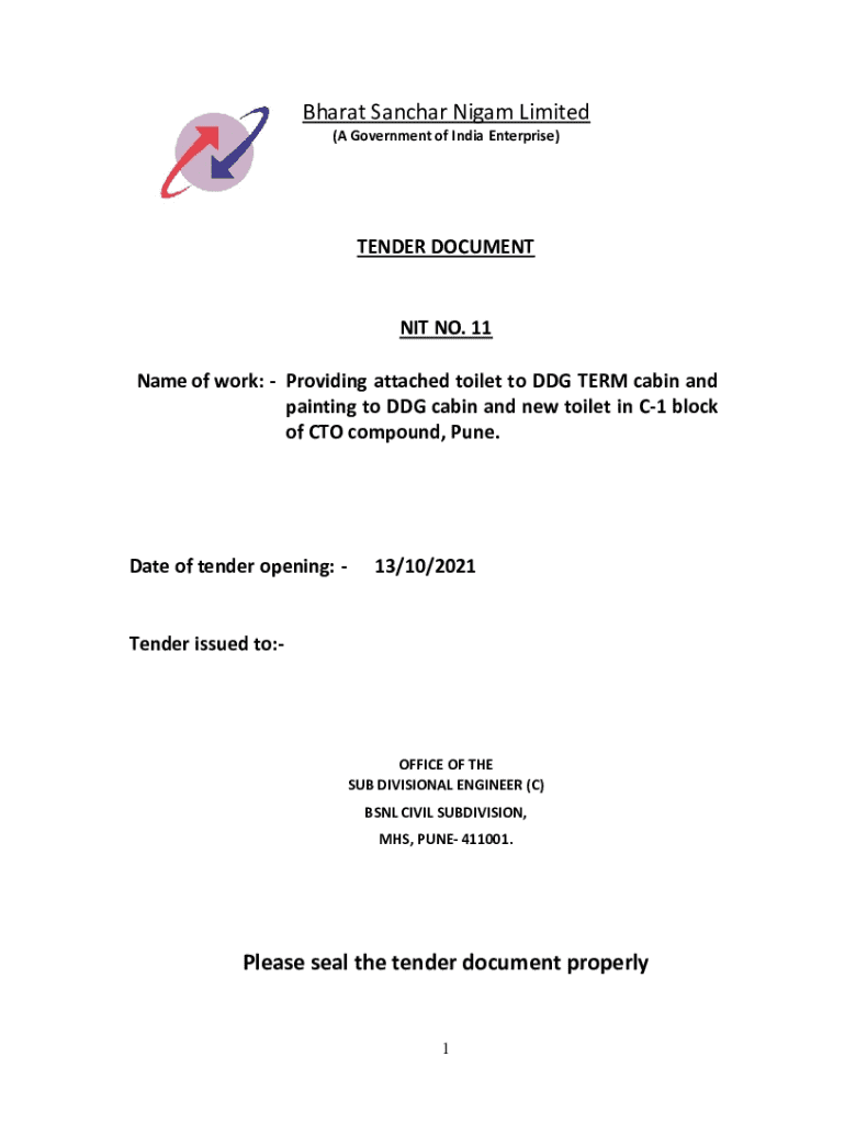 Bharat Sanchar Nigam LimitedR(A Government of India Enterprise)TENDER DOCUMENTNIT NO. 11 Name of work: Providing attached toilet to DDG TERM cabin and painting to DDG cabin and new toilet in C1 block
