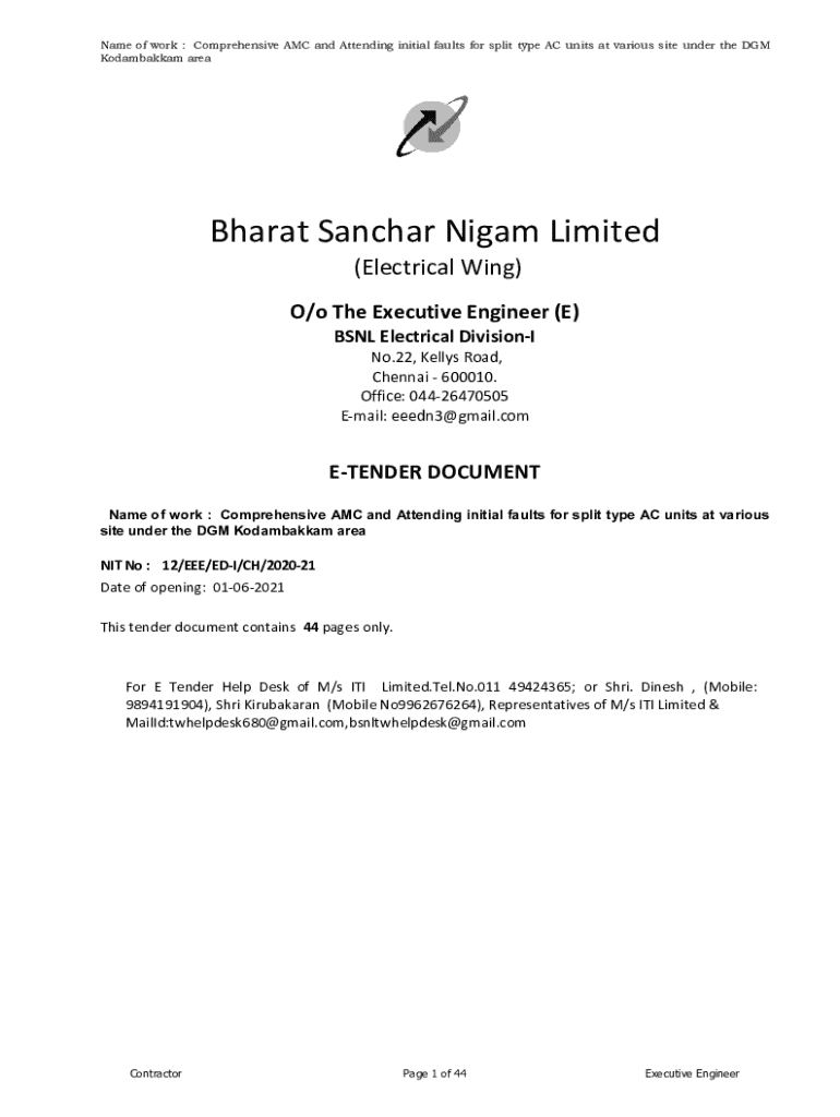 Name of work : Comprehensive AMC and Attending initial faults for split type AC units at various site under the DGM Kodambakkam areaBharat Sanchar Nigam Limited (Electrical Wing) O/o The Executive