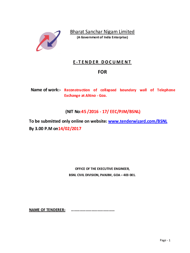 Tobesubmittedonlyonlineonwebsite:www.tenderwizard.com/BSNL