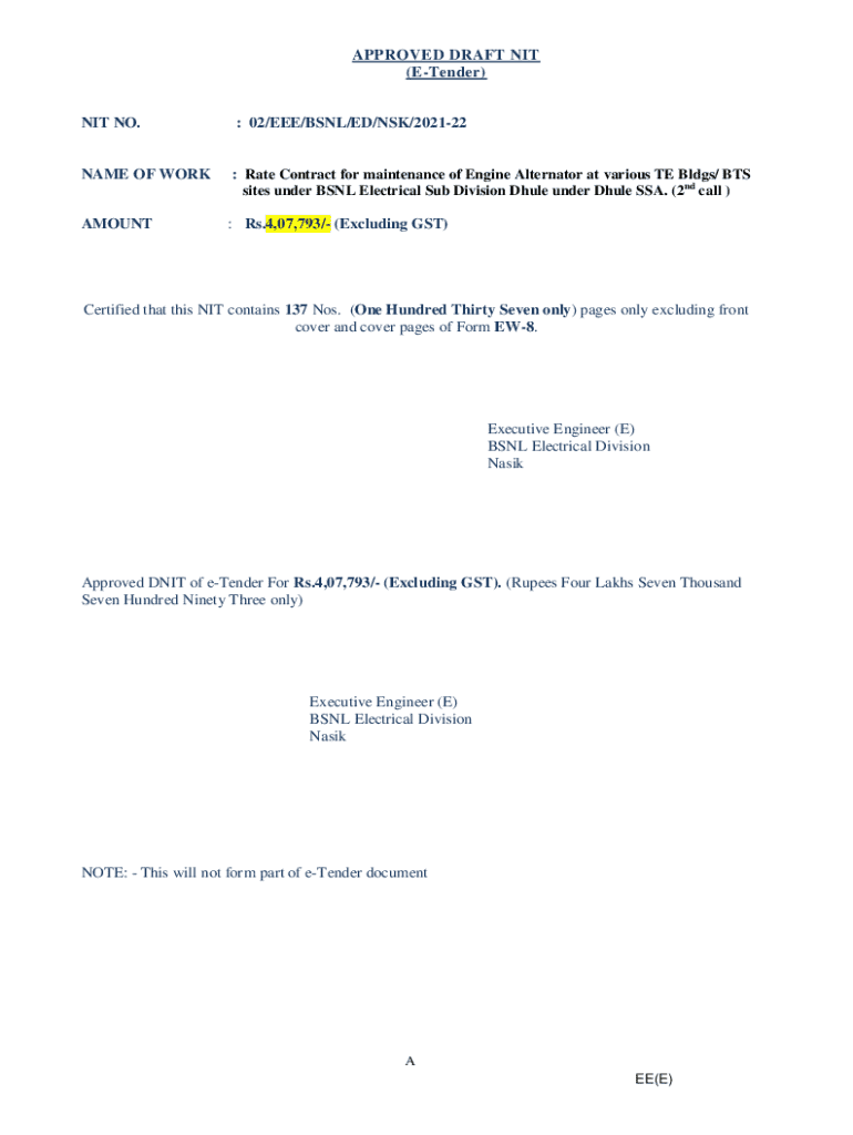 APPROVED DRAFT NIT (ETender)NIT NO.: 02/EEE/BSNL/ED/NSK/202122NAME OF WORK: Rate Contract for maintenance of Engine Alternator at various TE Bldgs/ BTS sites under BSNL Electrical Sub Division Dhule