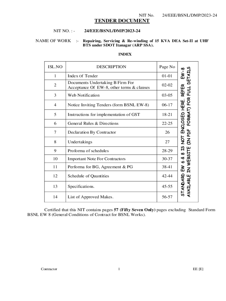 NIT No.24/EEE/BSNL/DMP/202324TENDER DOCUMENT NIT NO. : NAME OF WORK24/EEE/BSNL/DMP/202324 : Repairing, Servicing & Rewinding of 15 KVA DEA SetII at UHF BTS under SDOT Itanagar (ARP SSA).ISL.NODESCRIPTIONPage