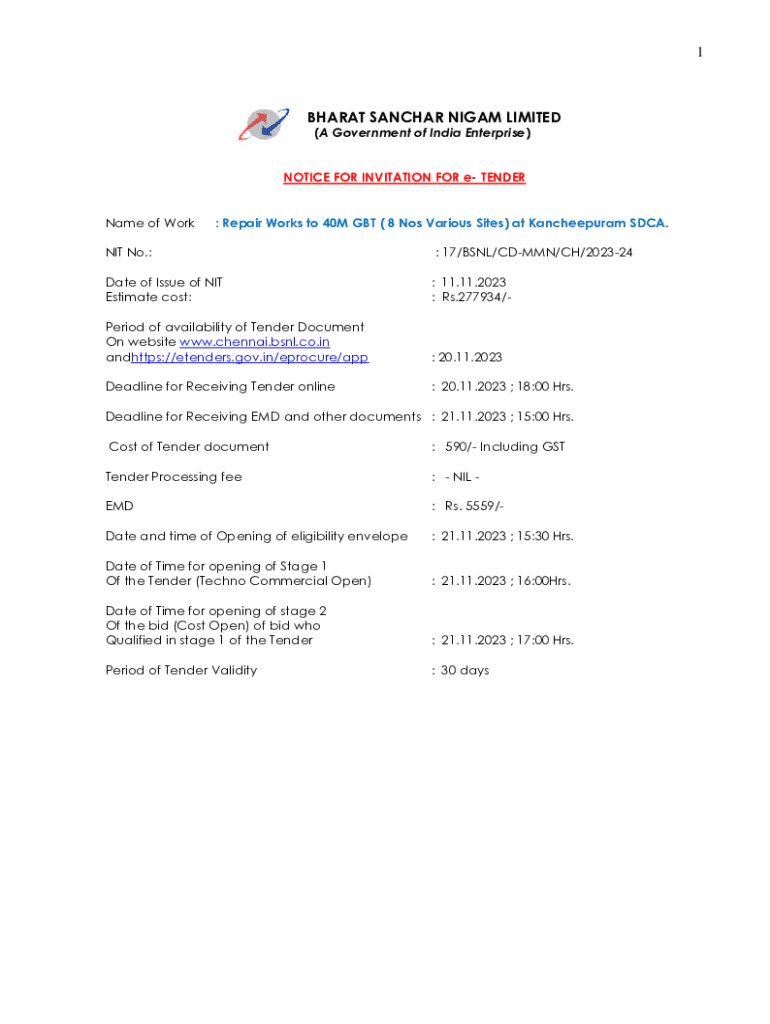 1BHARAT SANCHAR NIGAM LIMITED (A Government of India Enterprise) NOTICE FOR INVITATION FOR e TENDER Name of Work: Repair Works to 40M GBT ( 8 Nos Various Sites) at Kancheepuram SDCA.NIT No.:: 17/BSNL/CDMMN/CH/202324Date