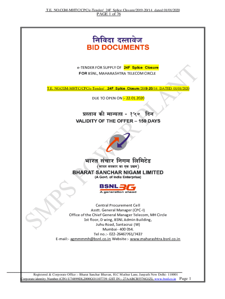 T.E. NO.CGMMHTC/CPC/eTender/ 24F Splice Closure/201920/14 dated 01/01/2020PAGE 1 of 76eTENDER FOR SUPPLY OF 24F Splice Closure FOR BSNL, MAHARASHTRA TELECOM CIRCLE T.E. NO.CGMMHTC/ CPC/eTender/ 24F