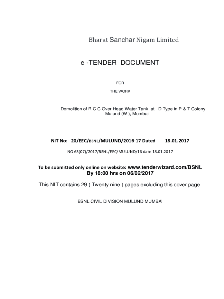 Mound (W), Mumbai No: 20/EEC/BSNL/MOUND/201617 Dated18.01.2017NO 63(07)/2017/BSNL/EEC/MOUND/16