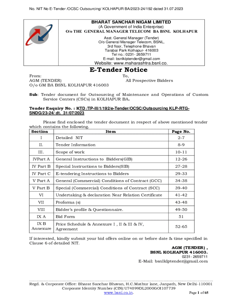 No. NIT No ETender /OCSC Outsourcing/ KOLHAPUR BA/202324/192 dated 31.07.2023BHARAT SANCHAR NIGAM LIMITED (A Government of India Enterprise) O/o THE GENERAL MANAGER TELECOM BA BSNL KOLHAPUR Asst.