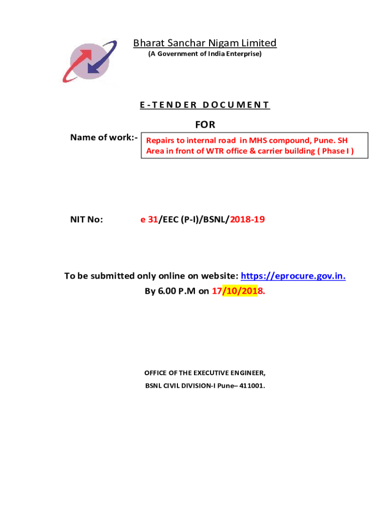 Bharat Sanchar Nigam Limited (A Government of India Enterprise)ETENDER DOCUMENTFORName of work: Repairs to internal road in MHS compound, Pune. SHArea in front of WTR office & carrier building ( Phase