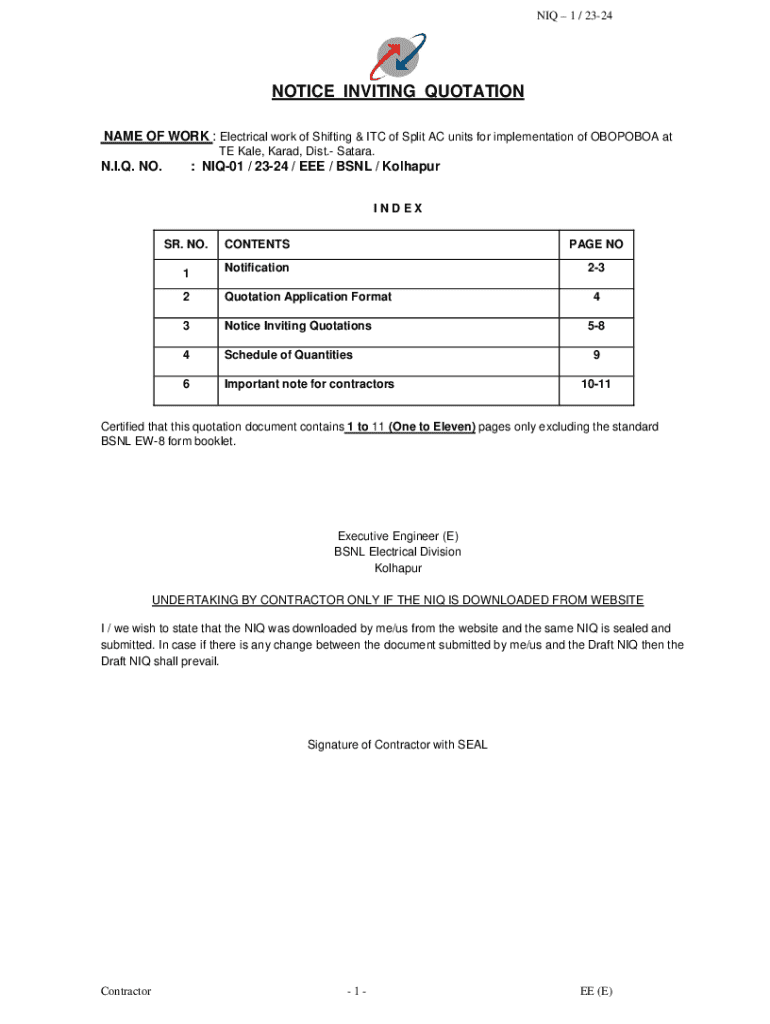 NIQ 1 / 2324NOTICE INVITING QUOTATION NAME OF WORK : Electrical work of Shifting & ITC of Split AC units for implementation of OBOPOBOA at TE Kale, Karad, Dist. Satara.N.I.Q. NO.: NIQ01 / 2324 / EEE