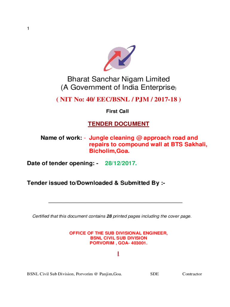 1Bharat Sanchar Nigam Limited (A Government of India Enterprise) ( NIT No: 40/ EEC/BSNL / PJM / 201718 ) First CallTENDER DOCUMENT Name of work: Jungle cleaning @ approach road and repairs to compound