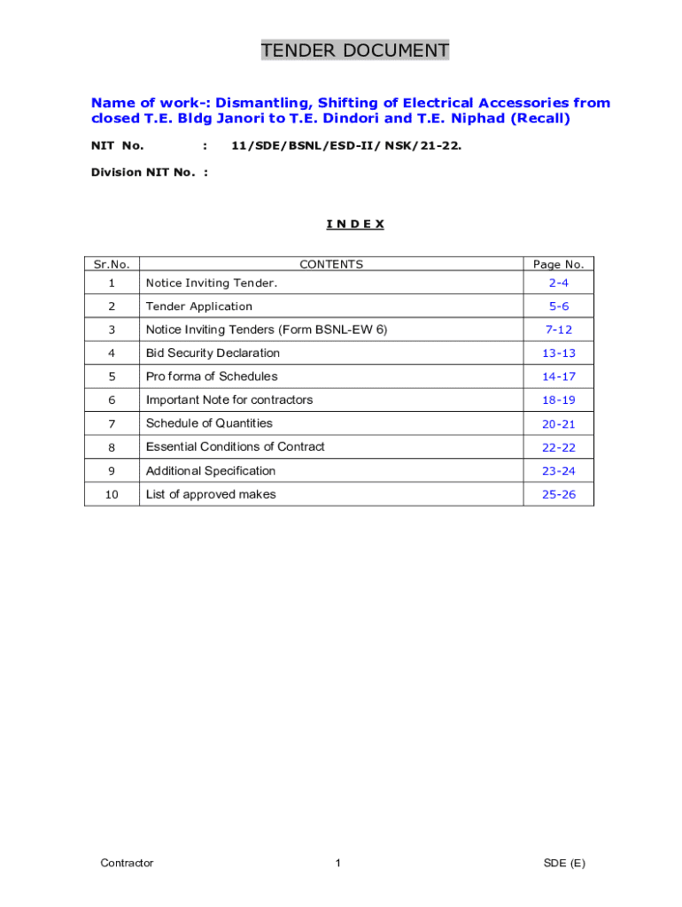 TENDER DOCUMENT Name of work: Dismantling, Shifting of Electrical Accessories from closed T.E. Bldg Janori to T.E. Dindori and T.E. Niphad (Recall) NIT No.:11/SDE/BSNL/ESDII/ NSK/2122.Division NIT