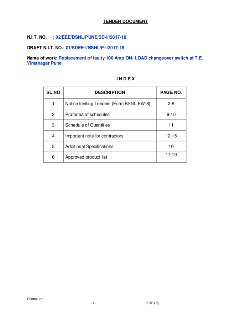 TENDER DOCUMENTN.I.T. NO.: 02/EEE/BSNL/PUNE/SDI//201718DRAFT N.I.T. NO.: 01/SDEEI/BSNL/PI/201718 Name of work: Replacement of faulty 100 Amp ON LOAD changeover switch at T.E. Vimanagar PuneINDEX SL.NODESCRIPTIONPAGE
