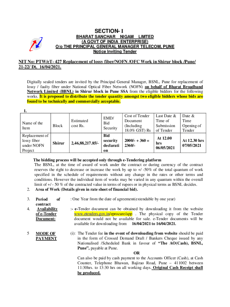 Notice Inviting Tenderest No: BTW/ET 427 Replacement of lossy fiber/NON /OF Work