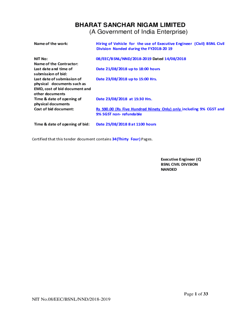 BHARAT SANCHAR NIGAM LIMITED (A Government of India Enterprise) Name of the work:Hiring of Vehicle for the use of Executive Engineer (Civil) BSNL Civil Division Nanded during the FY201820 19NIT No: