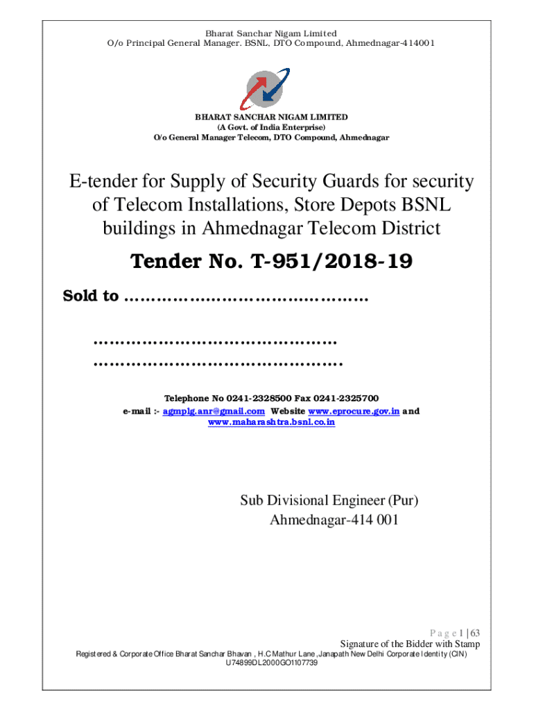 O/o Principal General Manager. BSNL, TO Compound, Ahmednagar414001BHARAT ANCHOR NI GAM LIMITED