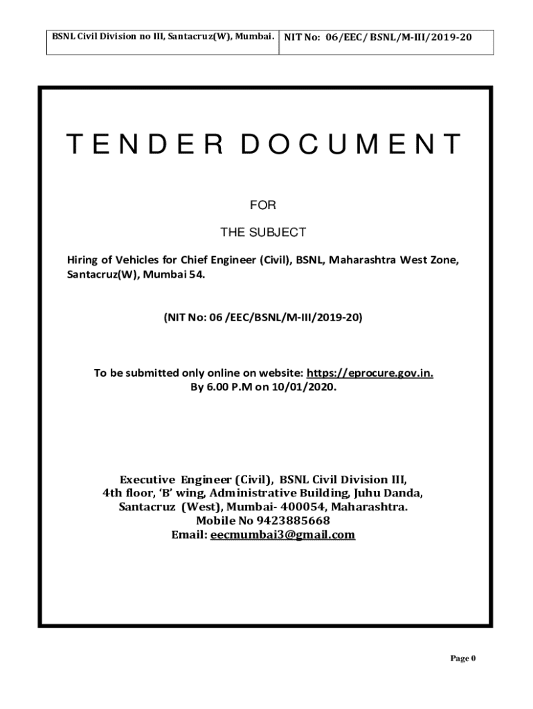 BSNL Civil Division no III, Santacruz(W), Mumbai.NIT No: 06/EEC/ BSNL/MIII/201920TENDER DOCUMENT FOR THE SUBJECT Hiring of Vehicles for Chief Engineer (Civil), BSNL, Maharashtra West Zone, Santacruz(W),