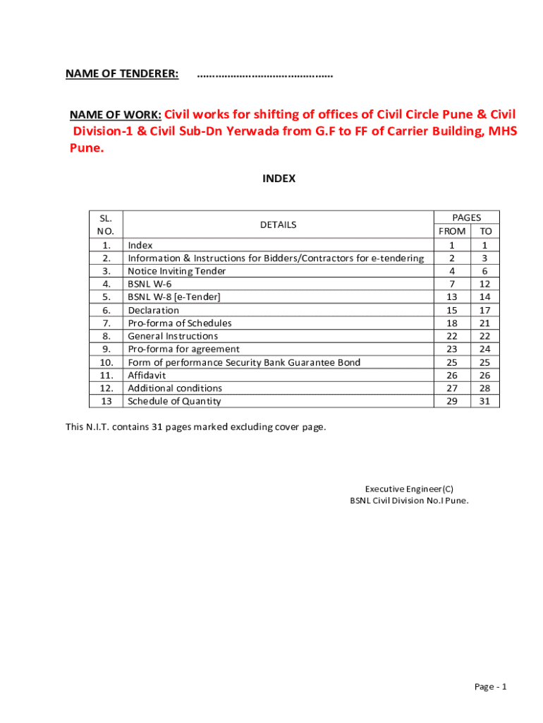 NAME OF TENDERER:NAME OF WORK: Civil works for shifting of offices of Civil Circle Pune & CivilDivision1 & Civil SubDn Yerwada from G.F to FF of Carrier Building, MHS Pune. INDEX SL. NO. 1. 2. 3.
