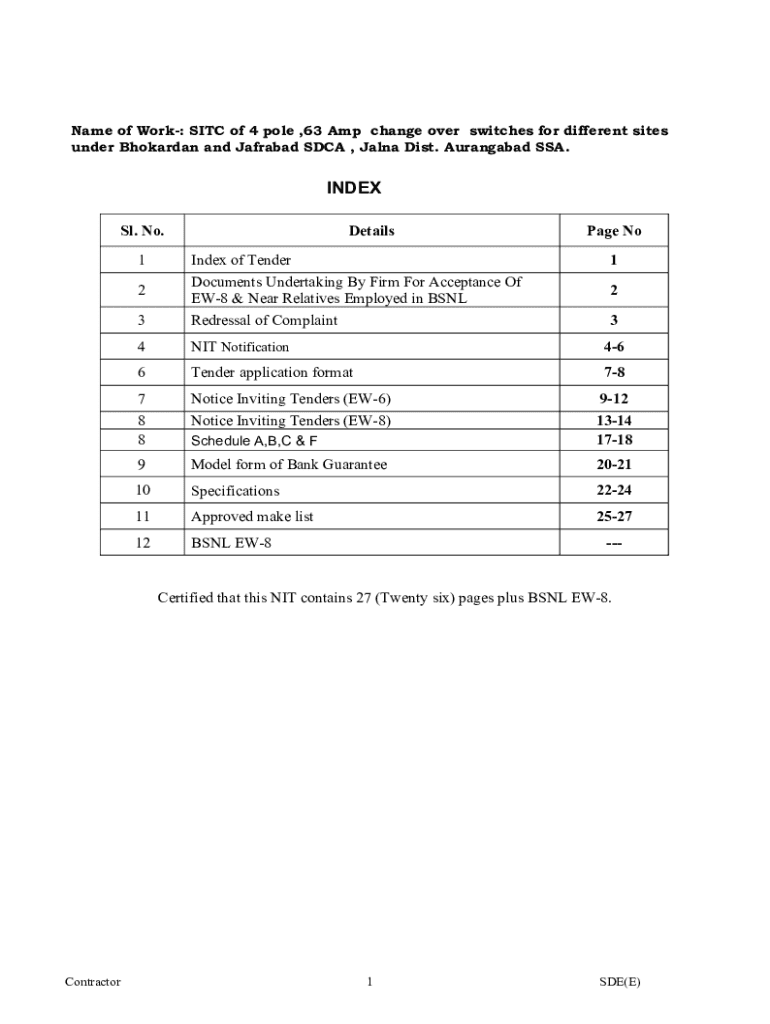 Name of Work: SITC of 4 pole ,63 Amp change over switches for different sites under Bhokardan and Jafrabad SDCA , Jalna Dist. Aurangabad SSA.INDEX Sl. No. 1DetailsPage No3Index of Tender Documents