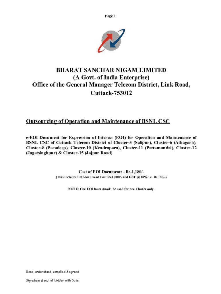 Page 1BHARAT SANCHAR NIGAM LIMITED (A Govt. of India Enterprise) Office of the General Manager Telecom District, Link Road, Cuttack753012Outsourcing of Operation and Maintenance of BSNL CSC eEOI Document